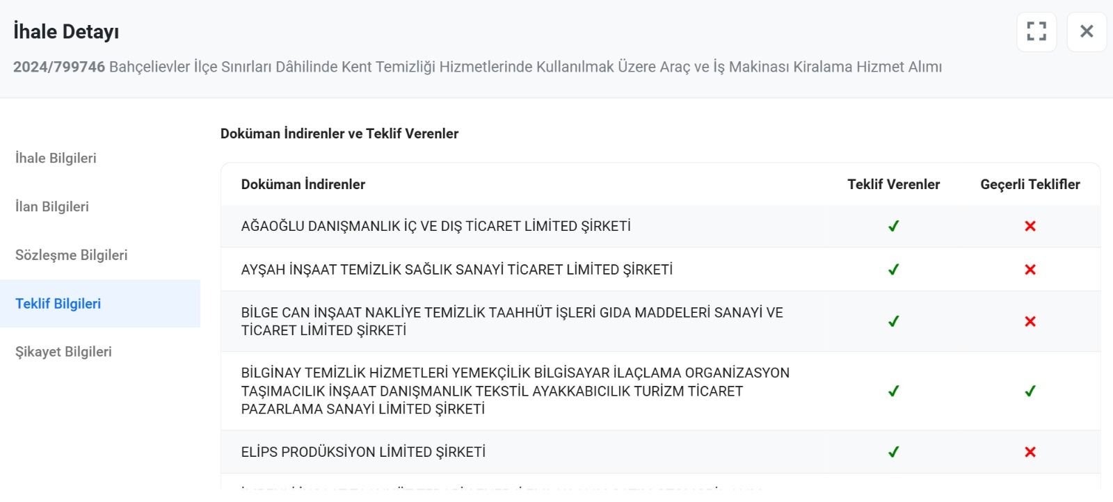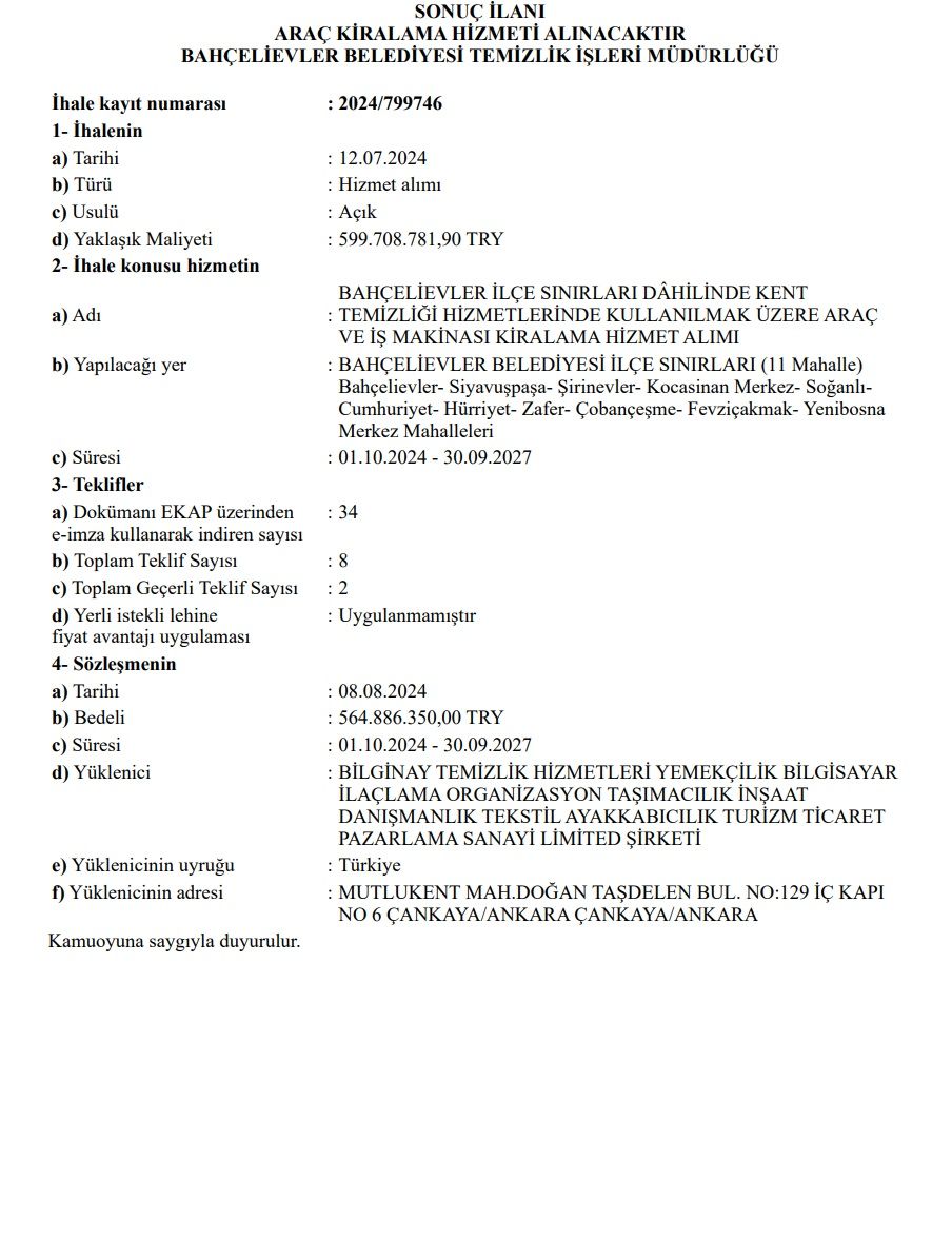 Bahçelievler Belediyesi’nin 2024 yılının ağustos ayında yaptığı ihalenin detayları ise şöyle; Bahçelievler Belediyesi’nin yaptığı ihaleye 34 firma katılıyor, 8 firma teklif verirken Bilgenay firmasının da arasında olduğu sadece 2 firmanın teklifi geçerli sayılırken Aziz İhsan Aktaş’ın şirketi Bilgenay Bahçelievler Belediyesi’nin temizlik işlerinde kullanılacak araçların ihalesini kazanıyor.