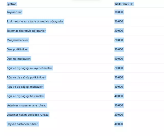 Ayrıca kuyumculuk, ikinci el araç satışı, taşınmaz ticareti, özel sağlık kuruluşları ve kıymetli maden işletmeleri gibi alanlarda yetki belgeleri ve ruhsatlar yıllık harca tabi olacak. Hürriyet’te yer alan habere göre; kıymetli maden rafinerileri için 7,5 milyon TL, ticari havacılık işletmeleri için ise 1–2 milyon TL arasında değişen ruhsat harçları alınacak. Büyükşehirlerde bu harçlar, nüfusu 30 bini aşan ilçelerde bir kat artırımlı uygulanacak.