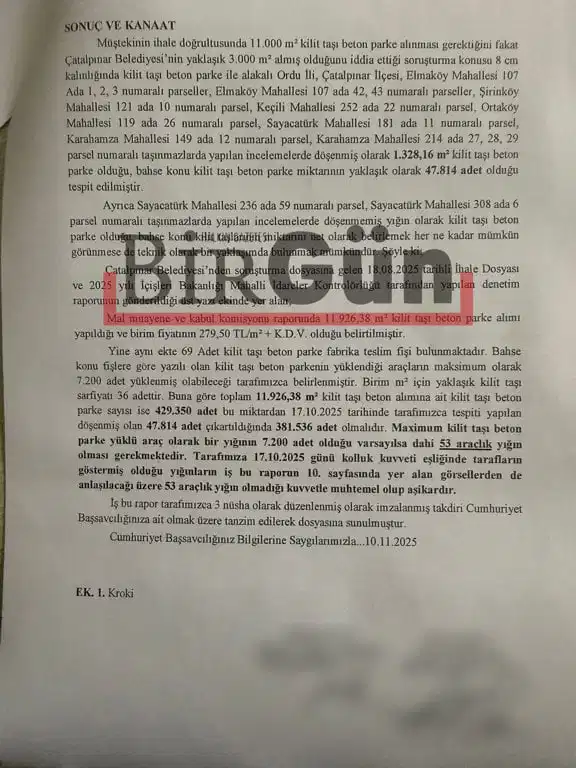 BirGün’ün ulaştığı bilirkişi raporunda, yollara döşenen ve yığın olarak bekletilen 11.926 m2’lik alanı kapsayacak yaklaşık 429.350 adet beton parke taşının Çatalpınar’da olmadığı net bir şekilde ortaya konuldu.